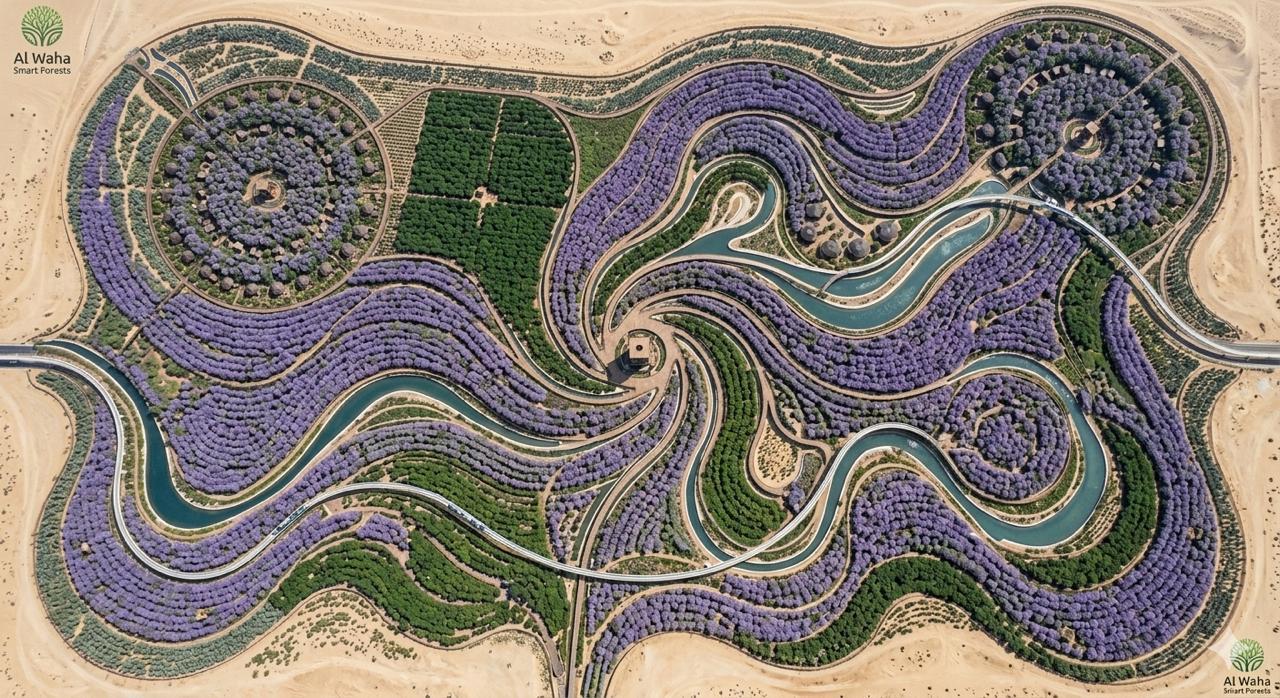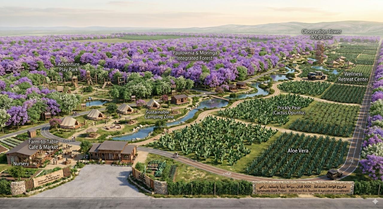 عرض بصري لتوزيع الزراعة، الضيافة، المسارات، والمناطق التشغيلية في المشروع.A visual overview of agriculture, hospitality, trails, and operating zones.